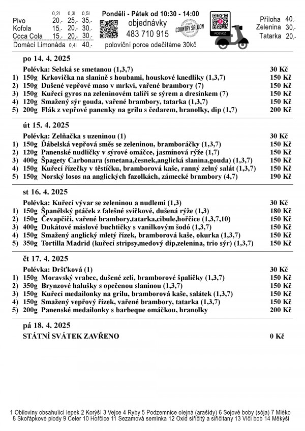 Polévka: Hráškový krém s krutony (1,3,7) |